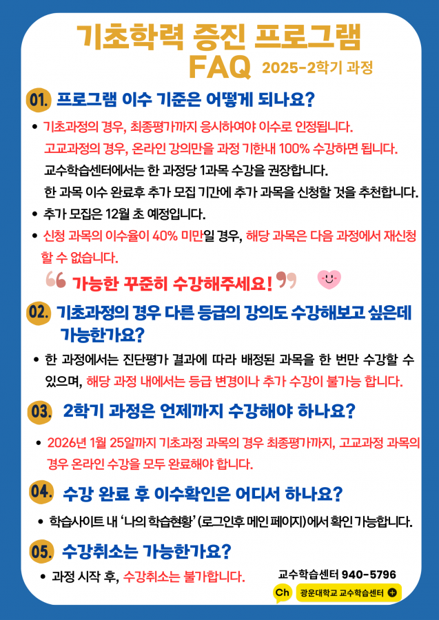 교육혁신원 교수학습센터에서 광운대학교 재학생을 위한 기초학력 증진 프로그램 2학기 과정을 운영합니다.
